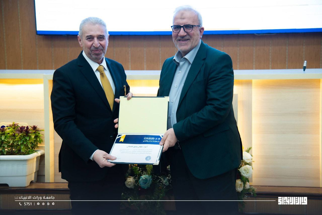 بحضور الأمين العام للعتبة الحسينية المقدسة، تتقدّم رئاسة جامعة وارث الأنبياء (عليه السلام) بخالص الشكر وعظيم التقدير إلى عميد كلية العلوم الإسلامية الأستاذ المساعد الدكتور طلال فائق الكمالي ؛ تثمينًا لجهوده العلمية والأكاديمية المتميزة التي قدّمها خلال عام 2025، وما أسهم به من عطاءٍ فاعل في تطوير الأداء الأكاديمي والارتقاء بالمستوى العلمي للكلية.