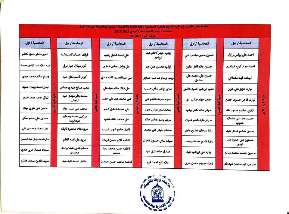 أحرز قسم المحاسبة في كلية الادارة والاقتصاد بجامعة وارث الأنبياء (عليه السلام) المركز الأول على الجامعات الأهلية وجاء في المرتبة الثامنة حكوميا ضمن نتائج التصنيف العراقي للأقسام العلمية، ما يعكس مستوى الأداء الأكاديمي المتميز للكلية ومكانتها المتقدمة ضمن مؤسسات التعليم العالي في العراق.