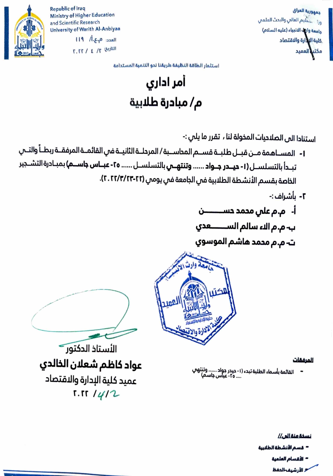 ساهم طلبة كلية الادارة والاقتصاد قسم المحاسبة المرحلة الثانية بمبادرة التشجير الخاصة بقسم الانشطة الطلابية في الجامعة