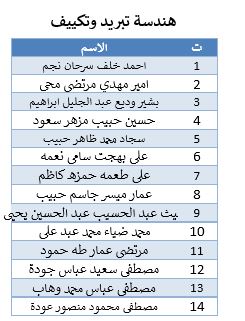 قســـم هنـــدســـة التكييف والتبريد نتائج الامتحانات النهائية للفصل الدراسي الأول للعام الدراسي 2017/2018 1 محجوب 2 ناجح 3 مكمل بمادة واحدة 4 ناجح 5 ناجح 6 ناجح 7 مكمل بمادتين 8 مكمل بمادتين 9 مكمل بمادتين 10ناجح 11ناجح 12مكمل بمادتين 13ناجح 14محجوب