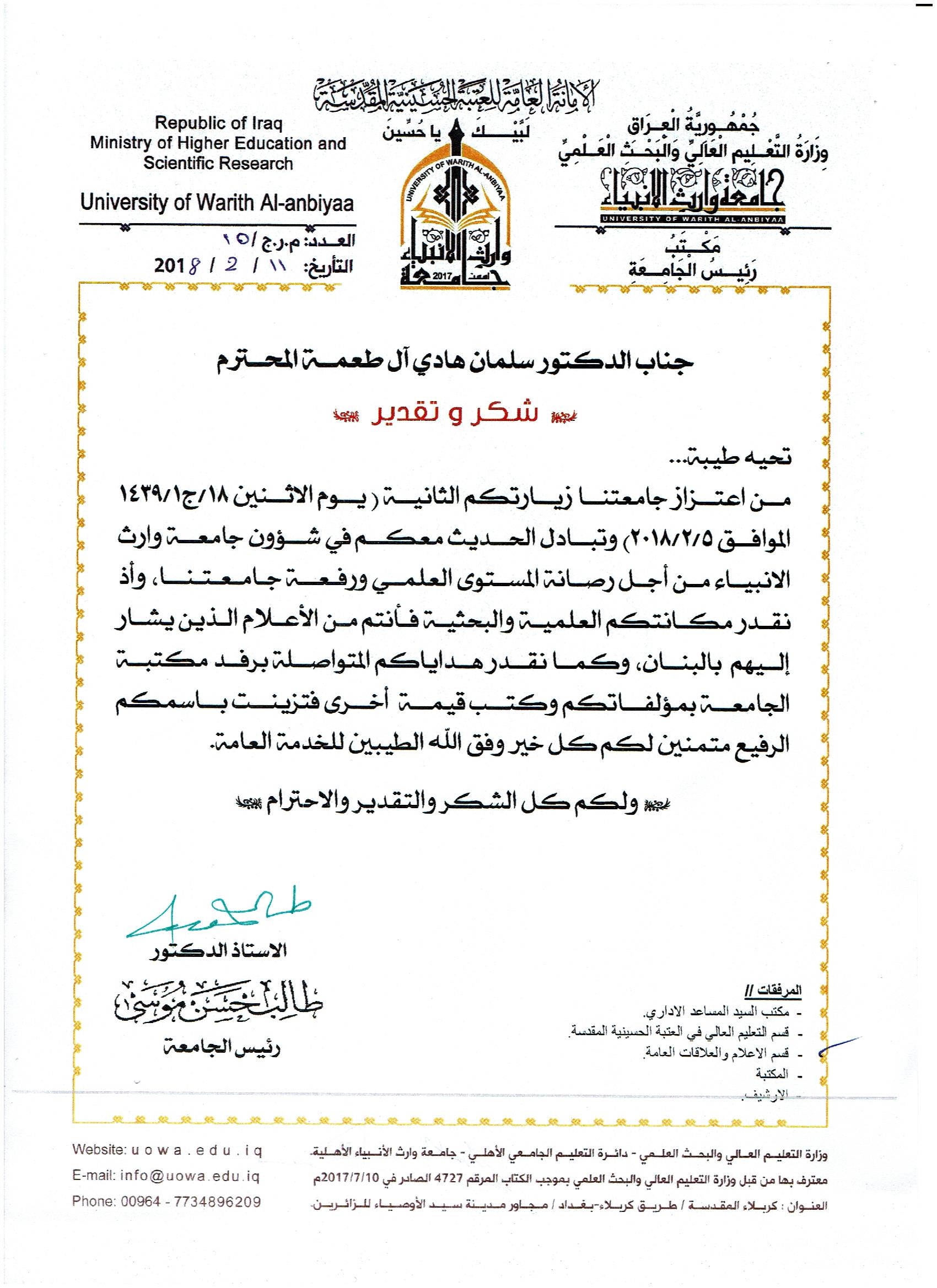 قدم الاستاذ الدكتور طالب حسن موسى رئيس جامعة وارث الانبياء كتاب شكر وتقدير للدكتور سلمان هادي ال طعمة لزيارته المتواصلة للجامعة ورفد مكتبة الجامعة بالعديد من الهدايا والمؤلفات والكتب القيمة التي تزينت باسم الدكتور، حيث وصف رئيس الجامعة الدكتورسلمان هادي تقديرا بانه من الاعلام الذي يشار اليهم بالمكانة العلمية والبحثية متمنيا له كل الخير والتوفيق للخدمة العامة.