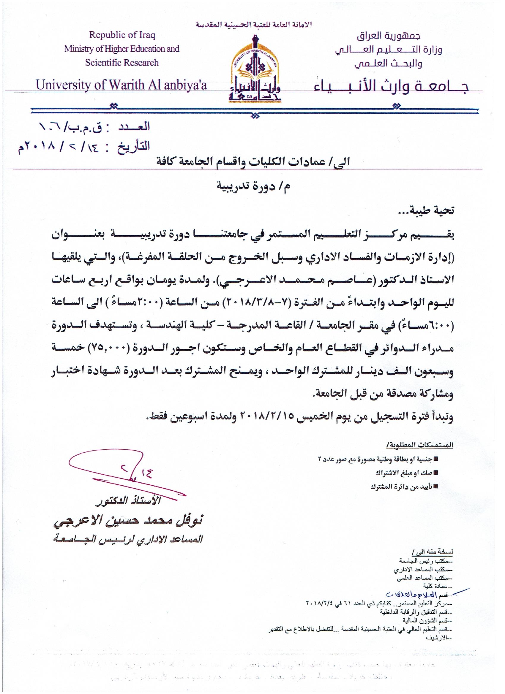 يقيم مركز التعليم المستر في جامعة وارث الانبياء دورة تدريبية لمـدراء الدوائر في القطاع العام والخاص بعنوان ( إدارة الازمـات والفـساد الاداري وسـبل الخـروج من الحلـقة المفـرغـة) والتي يلقيها الاستاذ الدكتور (عاصـم مـحـمـد الاعــرجي) ولمدة يومان من الفتره(7-8 /2018/3) في مبنى الجامعة الواقع على طريق بغداد - كربلاء مجاور مدينة سيد الاوصياء للزائرين علما ان فترة التسجيل تبدا من يوم الخميس 15/2/2018 ولمدة اسبوعين فقط بأجور اشتراك(75,000) للمشترك الواحد ويمنح المشارك شهادة مشاركة من المركز المعترف به من قبل وزارة التعليم العالي و البحث العلمي .