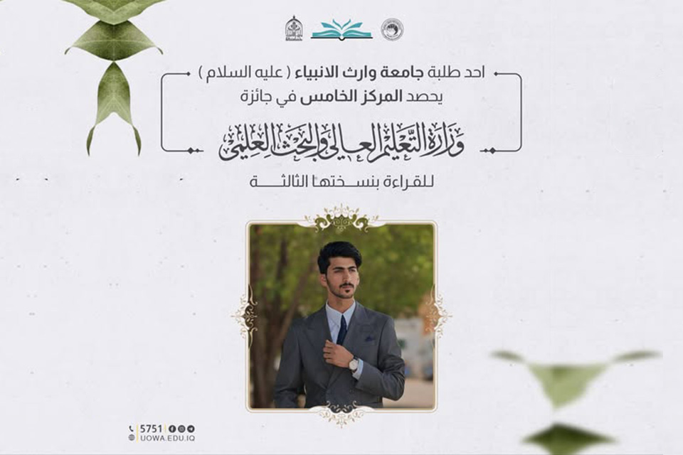 حقق الطالب برير مزهر أحمد عطية من كلية القانون والعلوم السياسية في جامعة وارث الأنبياء (عليه السلام)، المرتبة الخامسة في جائزة وزارة التعليم العالي والبحث العلمي للقراءة – النسخة الثالثة، ضمن مشاركة واسعة من طلبة الجامعات العراقية.