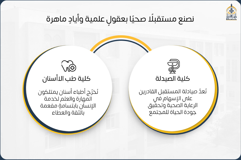 تجسد كليتا الصيدلة وطب الأسنان رؤية الجامعة في بناء جيل من الأطباء والصيادلة القادرين على الإبداع والابتكار في مجالاتهم، وتحقيق رسالة الجامعة في خدمة الإنسان والمجتمع.