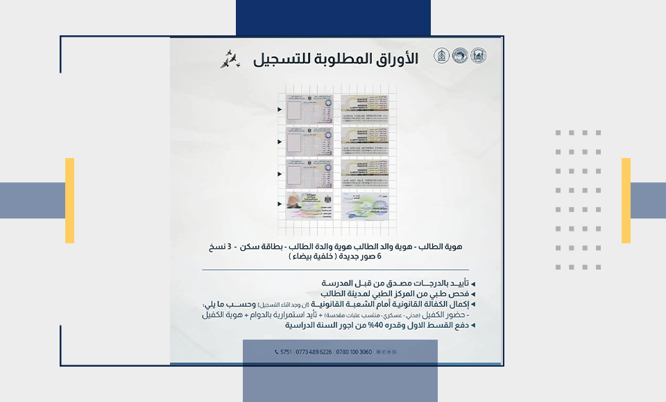 الدفعة الاولى البالغ قدرها 40% من القسط الكليويشمل ذلك جميع الطلبة، اضافة للطلبة الذين لديهم تخفيضات.أجور فتح الملف: تحدد رسوم فتح الملف بمبلغ 50000دينار.رسوم تفعيل تطبيق "قدم" عبر بطاقة ماستر كارد: تحدد بمبلغ 66,000دينار.يظهر للطالب عبارة "متاح للتسجيل " عندها يمكنه جلب كود التسجيل الى الجامعة.المستمسكات المطلوبة لعملية التسجيل:- كود التسجيل (ويتم الحصول عليه من خلال التطبيق).- الوثيقة الدراسية المصدقة اوتأييد بالدرجات- شهادة الجنسية وهوية الأحوال المدنية أو البطاقة الوطنية الموحدة (للطالب والاب والام).- صور حديثة عدد ٦- استمارة الفحص الطبي #ان_وجد-حضور الكفيل مع تأييد استمراية الخدمة وهوية الدائرة( يمكن جلب الكفيل خلال شهر من تاريخ التسجيل)-جلب الدفعة الاولى من القسط السنوي والبالغ ٤٠%-بطاقة #دفع_إلكتروني لدفع مبلغ 66 الف دينار إلكترونياً لتفعيل البرنامج الطالب الوزاري.نود اعلام الطلبة الاعزاء ان فريق التسجيل متواجد طيلة ايام الاسبوع من الساعة 8صباحا الى 5 مساءللاستفسار يرجى الاتصال على الأرقام التالية:الرقم المختصر :575107734896226