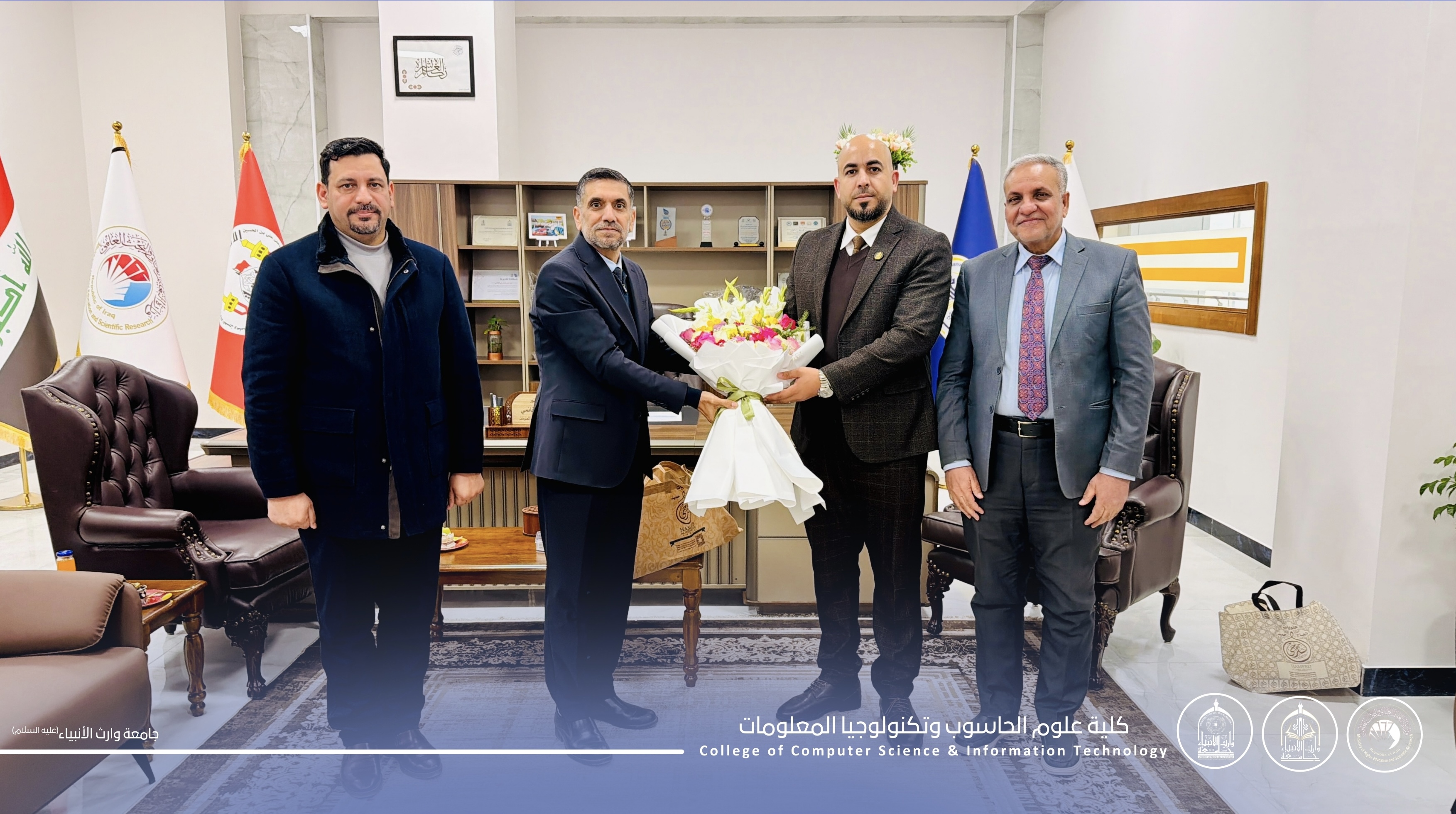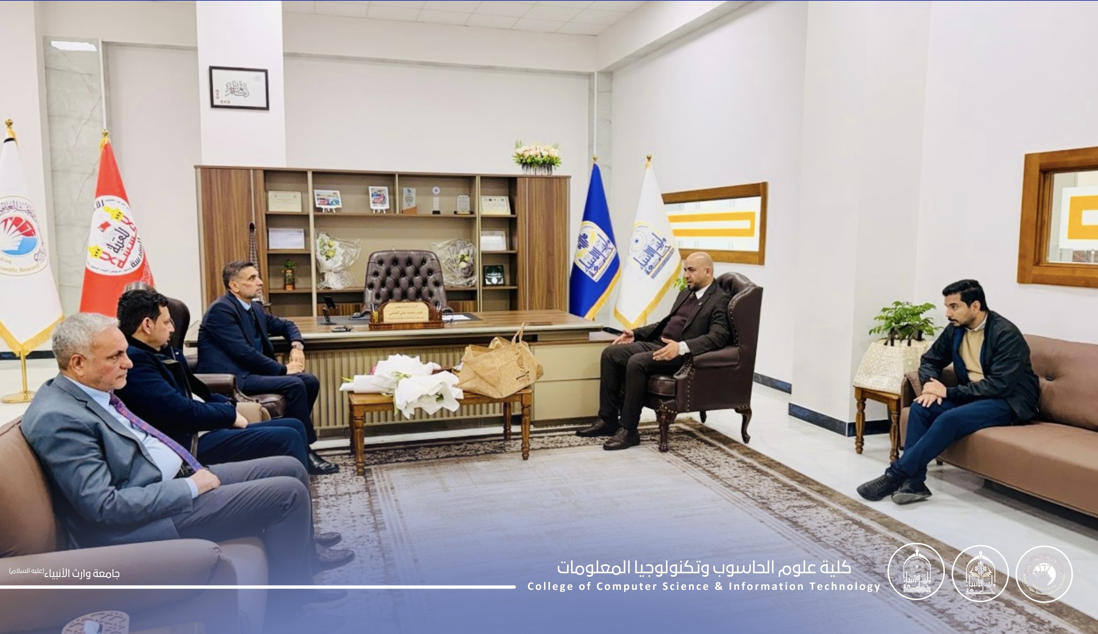 The Dean of the College of Computer Science and Information Technology, Assistant Professor Dr. Haider Mohammed Ali Al-Ghanami, received a high-level delegation from the College of Engineering – Warith Al-Anbiyaa University, headed by Assistant Professor Dr. Hussein Hadi Hussein, Dean of the College, accompanied by a group of faculty members.